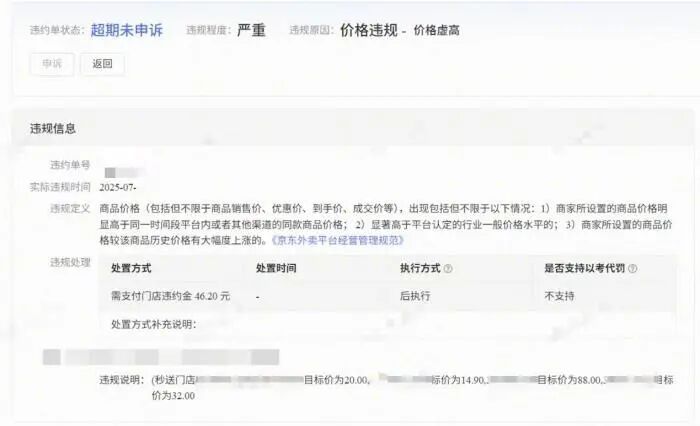 上述商家提供的《京东外卖平台经营管理规范》显示,若商品价格明显高于同一时段平台内或其他门店的同款、行业一般水平或自身历史价格,商家可能面临“罚款”。