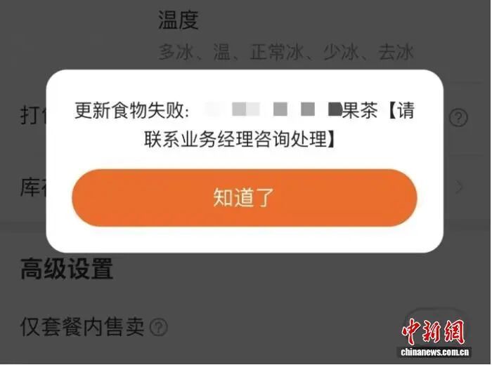 淘宝闪购商家涨价提示需联系业务经理。受访者供图