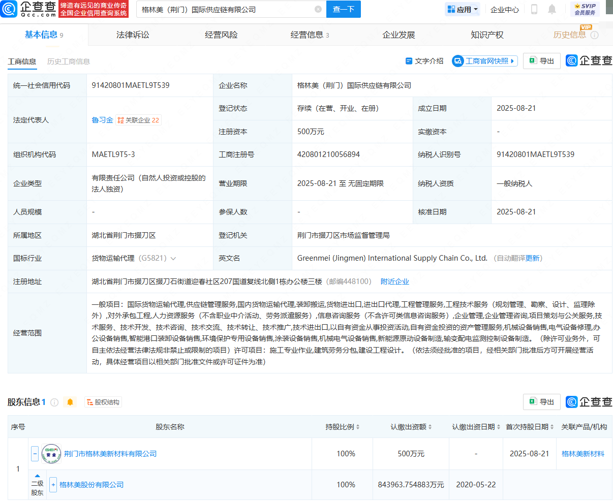 近日,格林美(荆门)国际供应链有限公司成立,法定代表人为鲁习金,经营范围包含:国际货物运输代理;供应链管理服务;国内货物运输代理;装卸搬运;货物进出口等。企查查股权穿透显示,该公司由格林美(002340)间接全资持股。